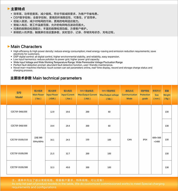 Through the application of high-performance embedded charging control unit, CZC7SF series charger could control charging current. Main circuit with parameter-optimized design could provide continuously adjustable charging current, thus meeting various charging process requirements.