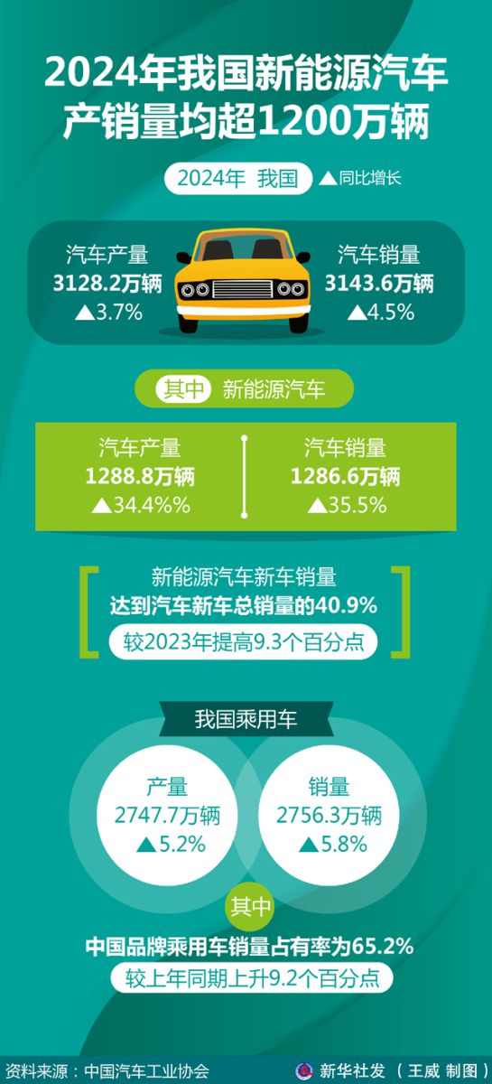 記者1月13日從中國汽車工業(yè)協(xié)會獲悉,2024年,我國汽車產(chǎn)銷量分別達3128.2萬輛和3143.6萬輛,同比分別增長3.7%和4.5%。其中,新能源汽車產(chǎn)銷量分別達1288.8萬輛和1286.6萬輛,同比分別增長34.4%和35.5%。