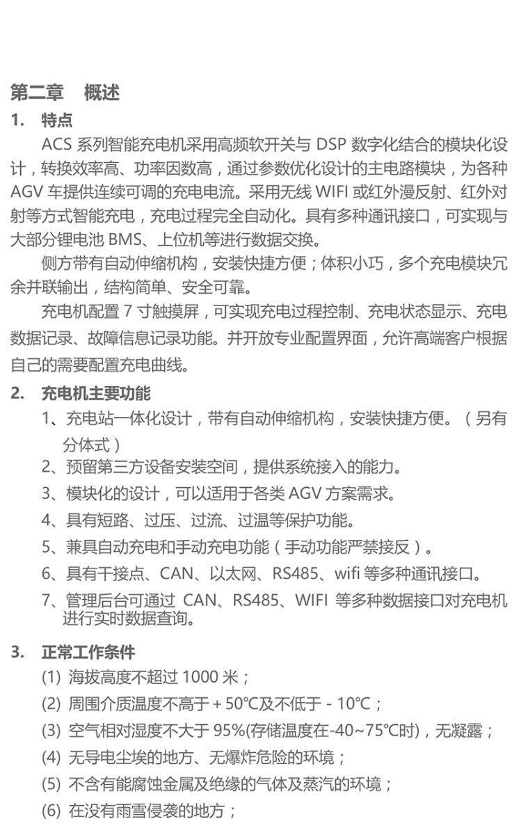 ACS系列智能充電機(jī)采用高頻軟開關(guān)與DSP數(shù)字化結(jié)合的模塊化設(shè)計(jì),轉(zhuǎn)換效率高、功率因數(shù)高,通過參數(shù)優(yōu)化設(shè)計(jì)的主電路模塊,為各種AGV車提供連續(xù)可調(diào)的充電電流。采用無線WIFI或紅外漫反射、紅外對(duì)射等方式智能充電,充電過程完全自動(dòng)化。具有多種通訊接口,可實(shí)現(xiàn)與大部分鋰電池BMS、上位機(jī)等進(jìn)行數(shù)據(jù)交換。