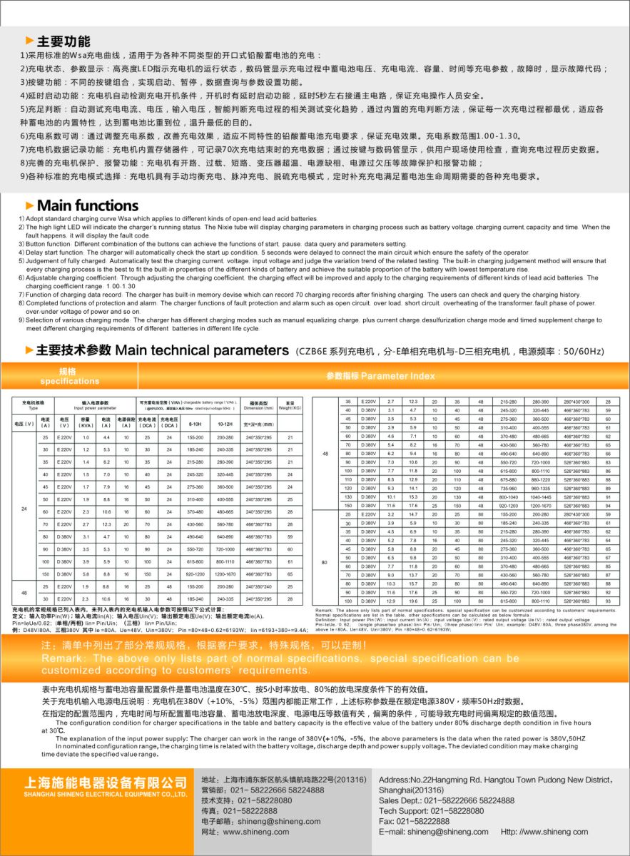 CZB6E系列充電機(jī),主電路使用可靠的漏磁變壓器與整流二極管,通過充電控制器,實(shí)現(xiàn)標(biāo)準(zhǔn)的Wsa充電控制;充電控制器內(nèi)的充電曲線,采用優(yōu)化的充足判斷方式,滿足各種不同特性的蓄電池在各種應(yīng)用工況下的充電要求。