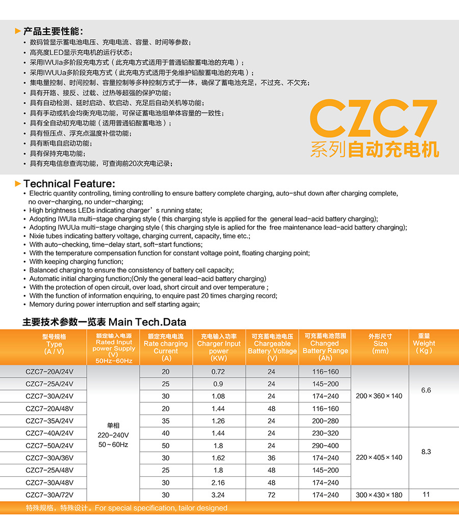 n:CZC7A系列充電機(jī)可設(shè)置充電電壓和電流,即通過設(shè)置不同的充電電流和電壓,可對(duì)不同規(guī)格的蓄電池進(jìn)行充電。